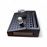 Solid smooth wood painted black for an easy to see tool holder. Features a magnetic side for easy grab and go, a long groove for holding your unmounted wheels and other tools, and felt cushions on the bottom of the stand to prevent scratching on your bench.