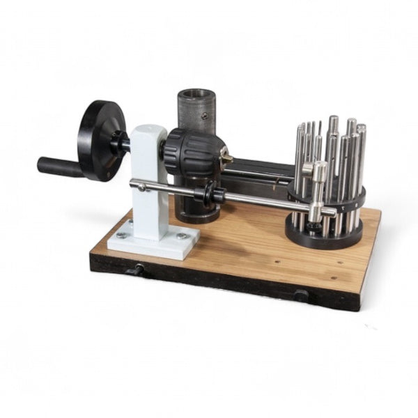 This jump ring maker can easily be mounted onto your work bench. It features a hand winding apparatus that coils wires uniformly to be cut into jump rings. The mandrels can be switched out to create coils in different shapes.