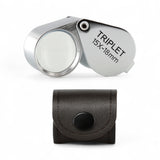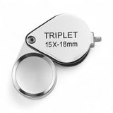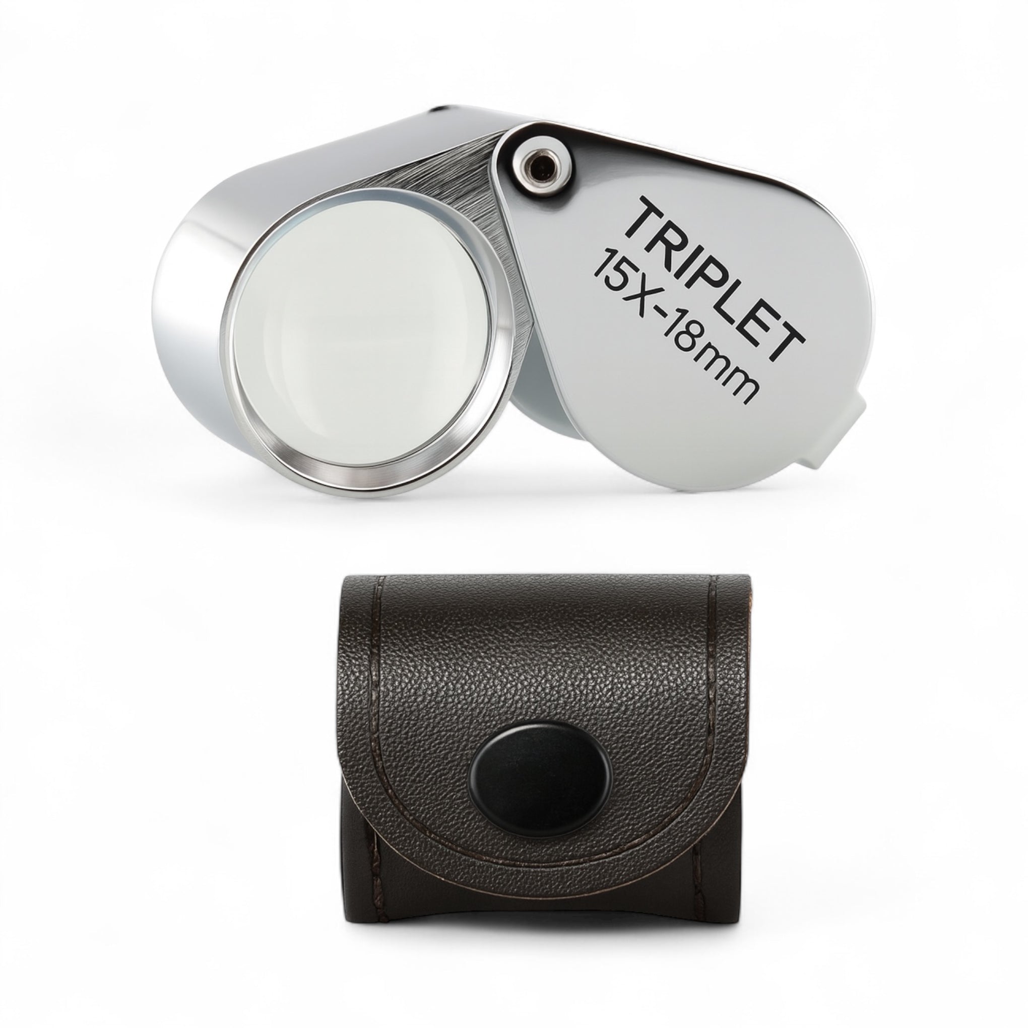 This compact chrome triplet loupe provides a sharp, distortion-free image; the 15X loupe is ideal for use both at the bench and on the road, wherever higher magnification is needed. The triplet lens is made of three lenses, highly corrected for spherical and chromatic aberrations, bonded to eliminate the optical distortions encountered in single-lens loupes. The chrome metal case swivels closed to protect the lens whenever the loupe is not in use. Includes a convenient leather case for easy storage.