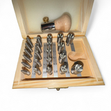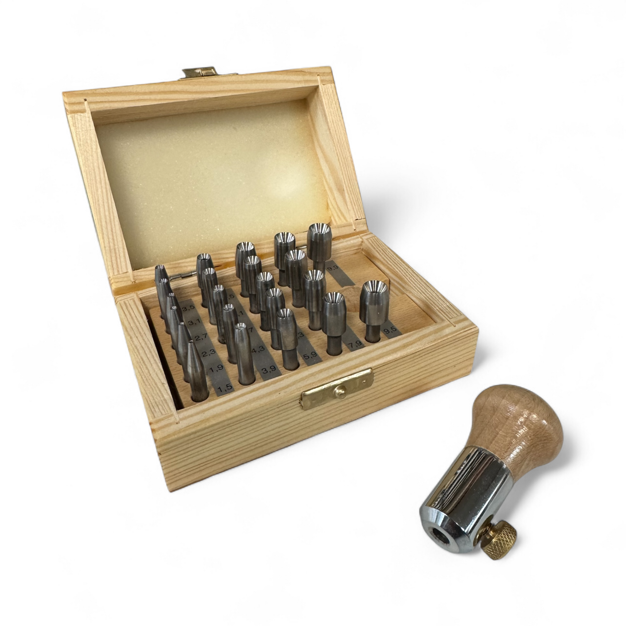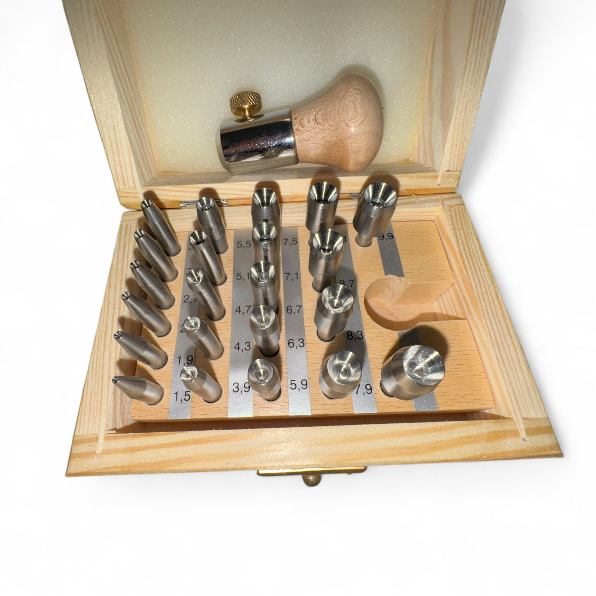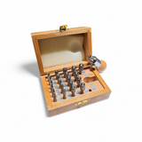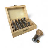 This set features 22 concave punches designed for precise and consistent closing of round bezels around stones, as well as securing prongs in settings. Sizes range from 1.5 to 9.9 mm, increasing in 0.4 mm increments. The punch holder includes a solid steel tang and a wooden handle. Produced in Europe, this set guarantees high-quality craftsmanship.