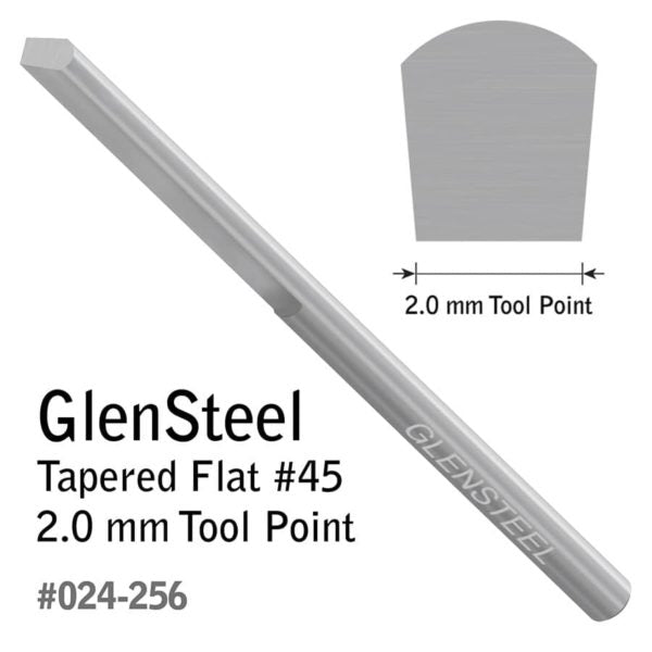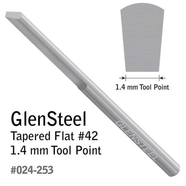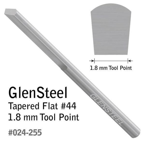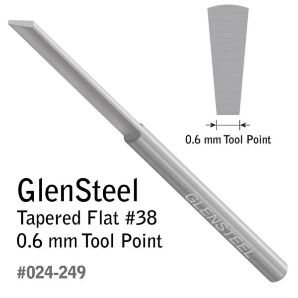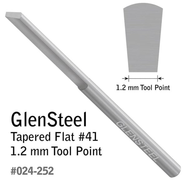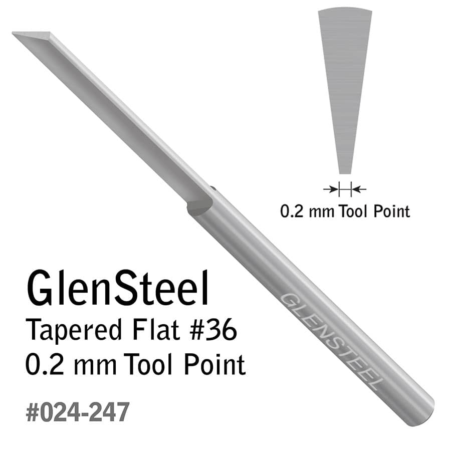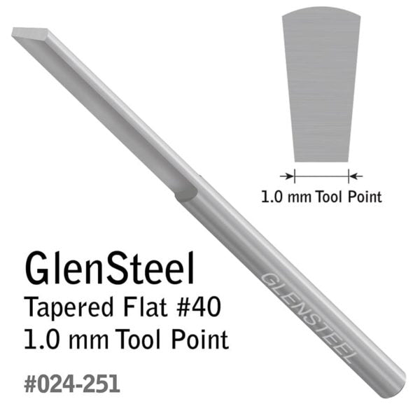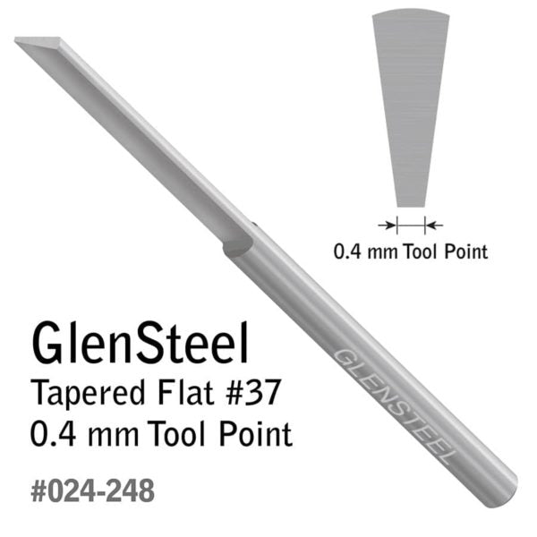 Preshaped but may need to be sharpened properly before use. This Tapered Flat has a wider flat top, a narrower flat bottom, and flat sides that angle down. Use a Tapered Flat for background removal, plain or stylized borders, bright cutting, lettering script, and wriggle cuts. Length: 2.3" (58.42 mm). Diameter: 0.125" (3.175 mm). This graver features two flat alignment areas on the shank for quick orientation in a QC Tool Holder. The set screws on GRS QC Tool Holders will contact the flat spots of the graver, ensuring that the graver is loaded accurately. Use with QC Tool Holder for 1/8" Round (#004-873).